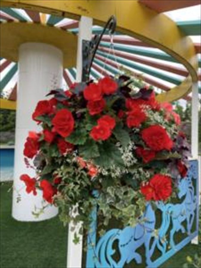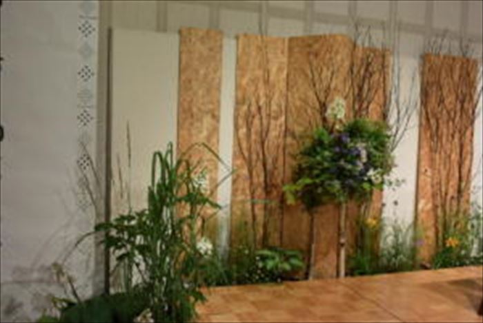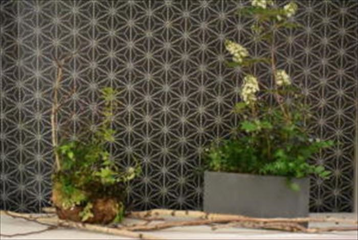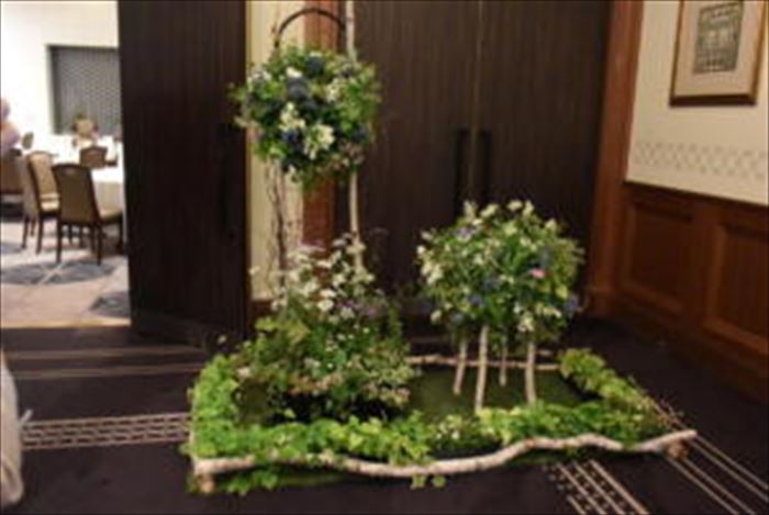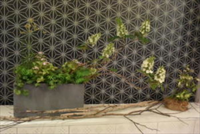 傾斜コンテナとラウンドバスケットは、昨年、本部講師の間室伸子先生に講習をして頂いた経験を活かし、今年はマスターが花材の選定やデザインを考えました。