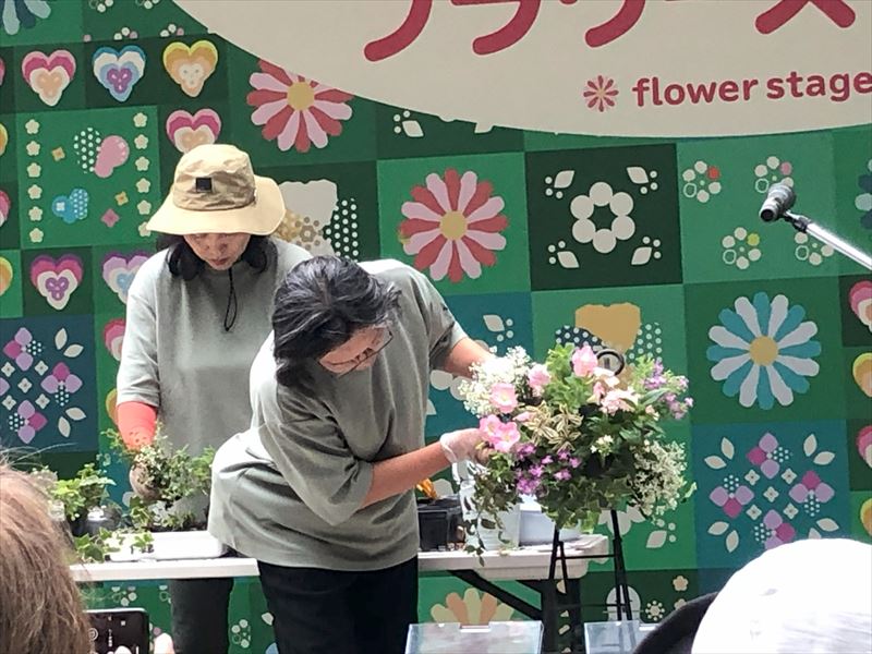 前からの眺めは観客のみなさんにお聞きして良い方向を決める場面もあり、和やかな雰囲気で、薄いピンク色のハンギングバスケットが完成しました。