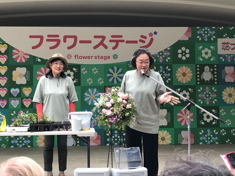 初日の6月22日は、午後2時から西6丁目会場特設ステージでハンギングバスケットの制作デモンストレーションを行いました。北海道支部の下館マスターが講師を務めました。