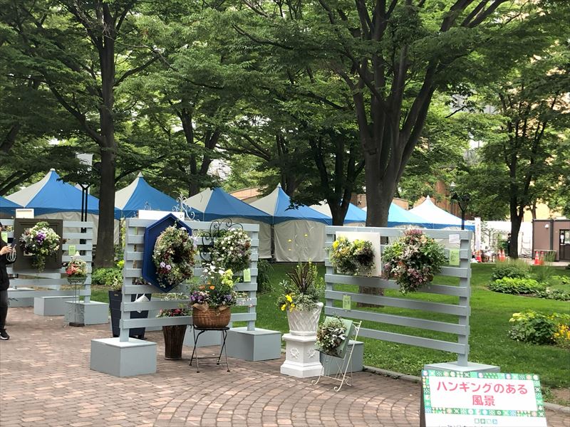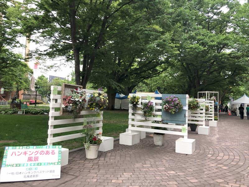 日本ハンギングバスケット協会北海道支部は、大通公園西6丁目会場で、ハンギングバスットやコンテナガーデンの展示と、寄せ植えやハンギングバスケット資材の販売を行っています。